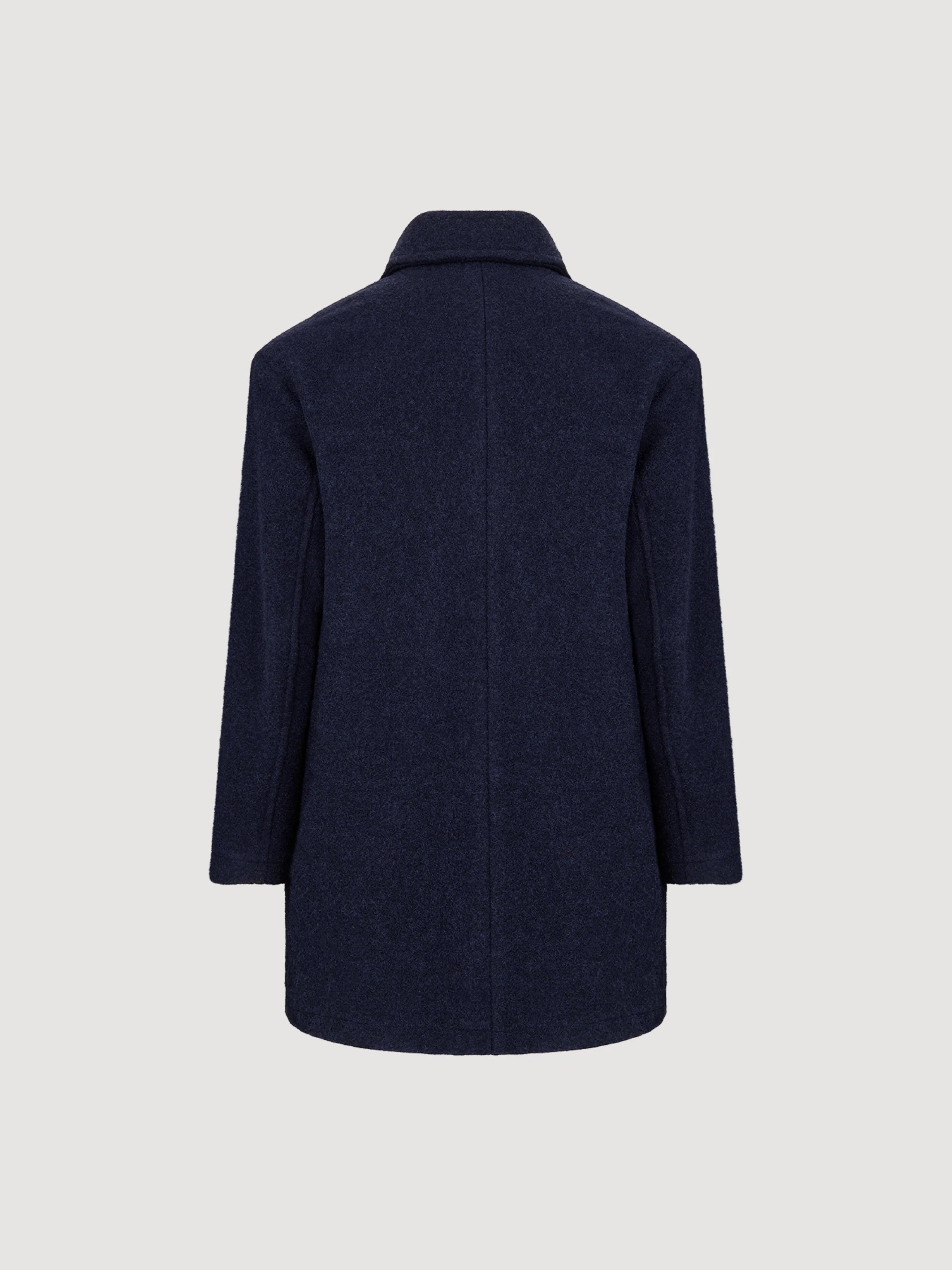 The Coconut Residence Indigo Oversized Wool Car Coat is crafted in England from pure wool, prized for its dense handle and natural ability to keep out cooler weather. Designed with a generous but contemporary silhouette, it offers elegant coverage across the torso and upper legs while maintaining a refined, flattering piece of outerwear for everyday wear.