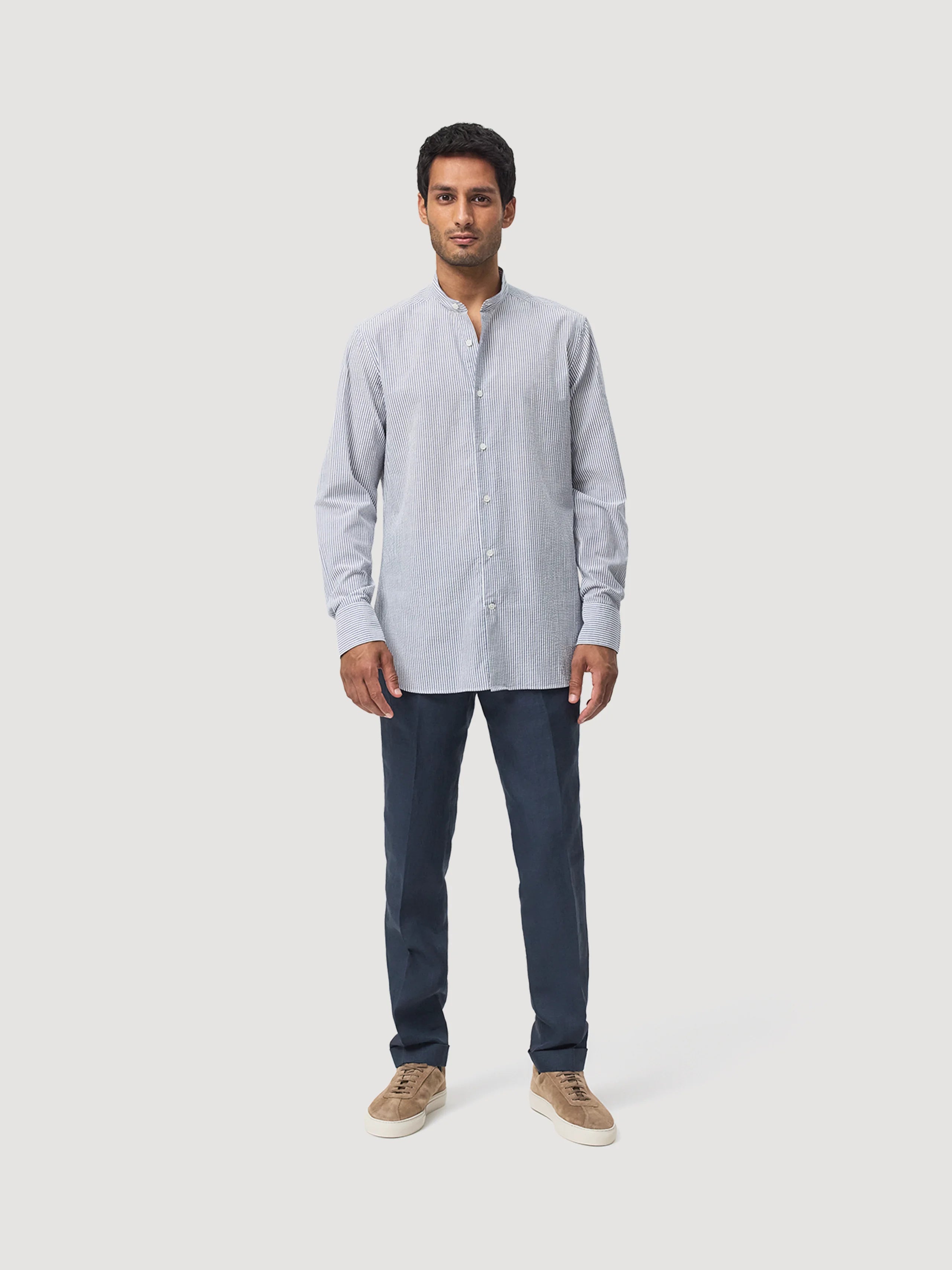 Navy & White Mandarin Collar Seersucker Shirt
