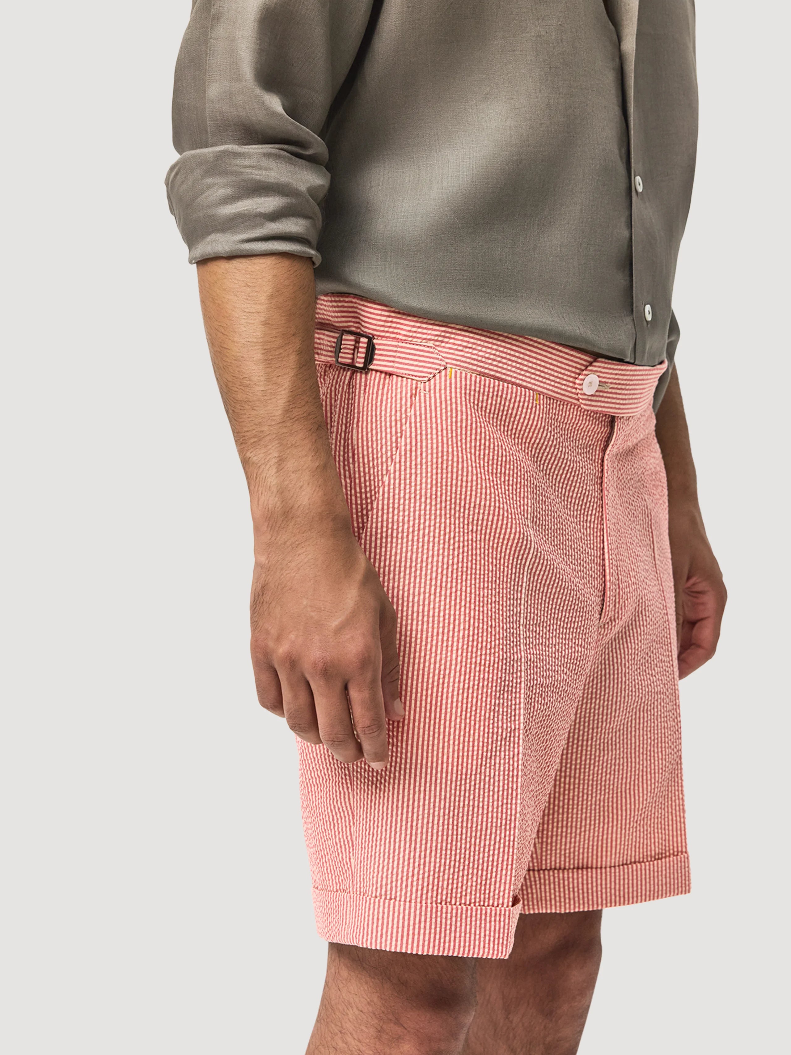 Our Coconut Residence tailored seersucker shorts are ideal for warm climates, whether at home or on holiday. Made in Italy from textured seersucker, they feature a ticket pocket and side adjusters for a refined look just above the knee. Comfortable and versatile, they can be paired effortlessly with a t-shirt or lightweight shirt, along with sandals or summer loafers.